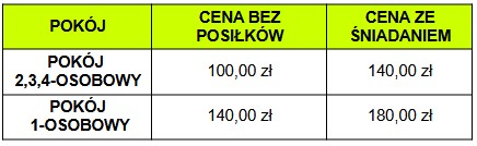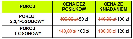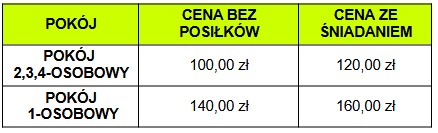 Ceny za osobę/dobę. Cennik obowiązuje poza okresem 7.11-11.11.2025.